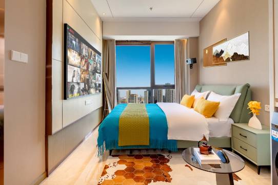 最惊喜的是高空观景效果,高楼层视野特别开阔,落地窗能直接看到城市风景,白天能俯瞰天府广场周边的街景,晚上灯光亮起,整个城市的夜景尽收眼底,氛围感特别好,坐在窗边发呆都很舒服。
