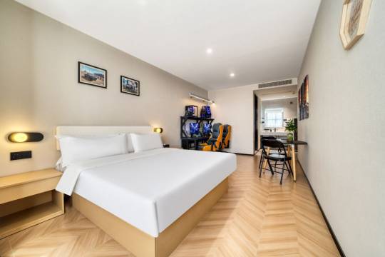 刚到酒店,就被它酷炫的外观吸引,仿佛是一座游戏里的未来城堡。前台工作人员超热情,办理入住方便。 走进房间,那叫一个惊喜!电竞设备堪称顶级,显卡、CPU性能强劲,玩大型游戏完全不卡顿,画面丝滑得就像德芙巧克力🍫 座椅是人体工学设计,坐久了也不会累,就像有双无形的手在给我按摩。 卫生情况也很棒,床单被罩干净整洁,卫生间没有一丝异味。 酒店还有冰箱可以存放食物和饮料,玩游戏饿了随时就能补充能量。还可以投屏看电影。而且位置超棒,周边交通便利,想去哪儿都方便。 这次入住体验简直绝了,以后来这儿玩,我就认准这家电竞酒店啦!
