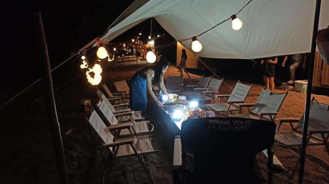 本店距鄯善县城约车程27公里,离库木塔格沙漠方便。娱乐项目包括沙漠越野(沙漠冲浪),滑沙,沙漠骆驼,沙漠卡丁车,油桶小火车。沙漠营地提供住宿,晚宴,烧烤,歌舞,KTV,篝火,烟花等服务。沙漠日出,日落,观星赏月,安逸自得!