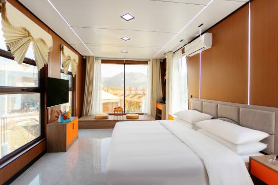 房间干净整洁,装修有品位!真的有宾至如归的感觉!这里服务也很到位,热情!远处风景一览无余!希望你们继续保持发扬!