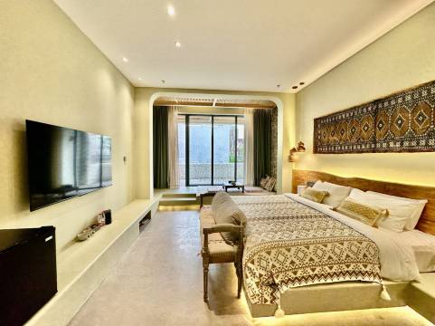春花公社民宿整体设计是地域性与诧寂风的完美结合,质朴的民居装饰、真实的生活场景,在民宿设计理念中精彩呈现。入住民宿,不仅可以饱览故城独特美景、尝遍地道和田美食,还可在游览故城的同时沉浸式观看新疆大型实景演艺“万方乐奏有于阗”。