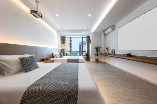 房间很大、很干净,而且前台小姐姐人很好,中途我们要了凳子和水,都送上来给我们了。此外,投影幕布很大,两个人看电影会很舒服。