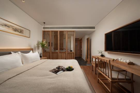 木质结构的房间是酒店的灵魂所在,处处透着古朴静雅的韵味。推开房门,一股淡淡的原木清香扑面而来,房间整体采用纯实木打造,从地板、家具到隔断,都选用了自然色系的木材,纹理清晰可见,在灯光下泛着温润的光泽。房间布局巧妙,既保留了传统民居的通透感,又兼顾了现代住宿的私密性,大面积的玻璃窗将室外的园林景致引入室内,形成“窗含西岭千秋雪”般的框景效果,让人在室内也能与自然相融。床品选用了柔软的白鹅绒材质,搭配素雅的棉麻床品,与木质家具相得益彰,躺上去仿佛被自然拥入怀中。细节处更见匠心,定制的木质茶具、古朴的陶瓷摆件、墙角的绿植盆栽,甚至连毛巾烘干架这样的实用设施,都设计得与整体风格统一,既古朴又不失便捷,真正做到了“低调奢美”。