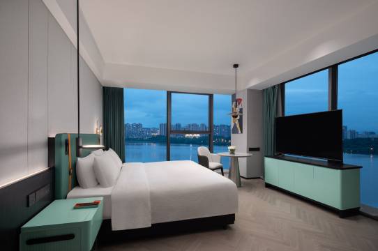 酒店配备奢华大气、时尚又不张扬的客房及套房,以摩登前卫的设计为商旅人士呈现别具一格的休憩空间,尽享湖景风光。房间提供冰箱、免费迷你吧、瓶装水、茶包等增值服务,更可体验免费高速无线网络、在线购物商城、智能机器人服务,虚拟与现实无缝对接。配套多功能会议室、24小时健身中心、自助洗衣房和全日制餐厅等。全新复合咖啡空间——万咖啡Wan-vita,令人在倾心打造的乐享空间中,不止于咖啡和轻食,它将成为所在区域的社群集合地、提供“樊登读书”、共享空间、商务会面等多元化服务。携酒店客房选用高品质环保沐浴产品;舒适的超大床垫全部采用全球知名寝具品牌;所有客房配套65寸高清液晶电视,并为您带来手机与电视互动投屏一键切换的顺畅体验;卫浴配备热带雨林沐浴系统、智能马桶、干湿分离,高品质羽绒及亲肤寝具等为您带来舒适的入住体验。