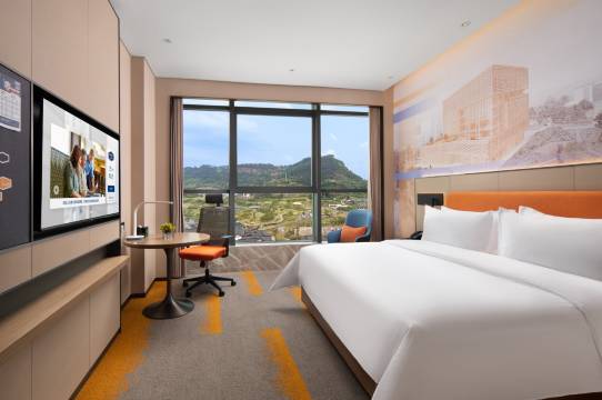 酒店很时尚,房间硬件好整洁干净。前台周周和波波服务热情,给我们免费升了级,房间看山景很漂亮。早餐也不错,选择丰富,有宜宾的特色燃面,味道好。3楼还有洗衣房和健身房,很便利。大堂商务休息区有无线充电的地方。下次还会来
