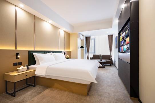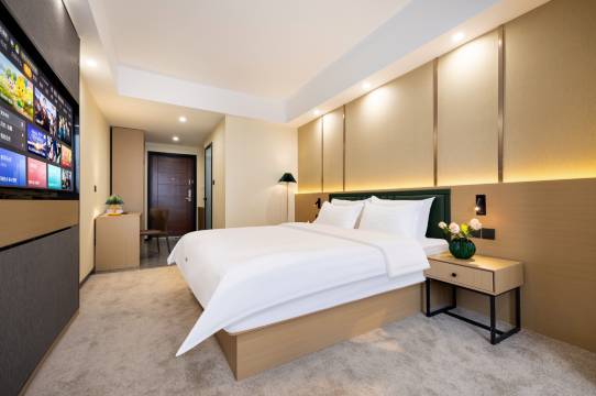 房间住的很满意!服务态度特别好,前台小美女长得漂亮还特别热情,有礼貌,办完入住以后主动帮我们把行李🧳拿到房间,全场微笑服务,前台24小时都有人让人特别有安全感,房间里还准备了欢迎点心还有饮料,屋子面积很大,很宽敞,收拾的特别干净,没有任何死角,住的很安心,特别好的一家酒店,大家放心来住