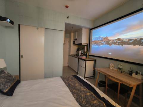 房间很好。打开窗就能看到阳澄湖景色,特别棒。而且投影也很好用。画面清晰。操作简单。麻雀虽小,五脏俱全。超棒!