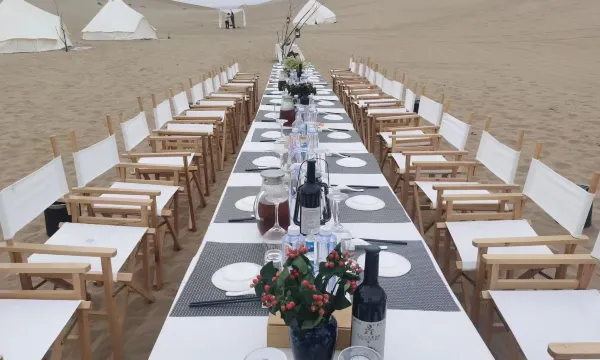 腾格里沙漠印迹露营地坐落在中卫市腾格里沙漠边深处,是沙漠观星为主题的沙漠野奢露营酒店,这是一个荒野和与世隔绝的避难所。可以在黄昏时聚在一起,围坐在在篝火前,晚上望远镜观看星空。篝火开始生机勃勃,聚集在繁星闪烁的广阔天空下讲故事。