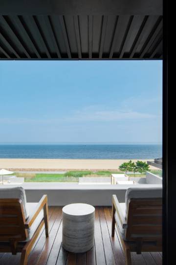 酒店庭院造景由厐喜主笔,用园林传达酒店的隐世理念、美学态度;酒店设有面向海岸沙滩舒展的观海平台以及一座17米无边泳池,池畔环绕有帐幔日间榻、躺椅和餐席,供宾客以自在、从容且优雅的姿态欣赏海天胜景共融,与自然对话;酒店底楼会客厅由绵延落地窗环绕,直面酒店的泳池平台和碧海沙滩,为酒店的起居空间注入了无限美感与生命力。