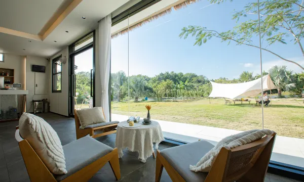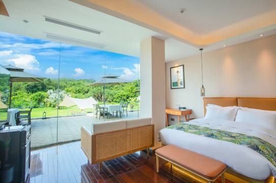 民宿占地约10亩,民宿涵盖度假高端住宿,休闲中心,户外露营,中餐厅,咖啡厅,海洋学院(海洋运动),及周边游项目;在国内著名设计师团队桥QIAO对涠洲岛独特的火山地貌,最终以“一半海水一半火焰“基础,尝试完成表达水元素和火元素的共生结合设计。岛屿精神致力于传达“启迪隐思”生活哲学,为每一位来客奉上海岛热情并激活其勇于创新的丰满收获;共13间高级客房,设置于一栋4层独立住宅楼中,有双套房为楼中楼与独立天台,2-3层为房型标准中型套房,一层为3间带浴池带独立庭院套房;13间客房命名均以四大洋洲特色海岛城市命名,18间客房均以海岛命名,其所在地海洋文化作为空间塑造,具私人专属独立体验与服务空间属性;