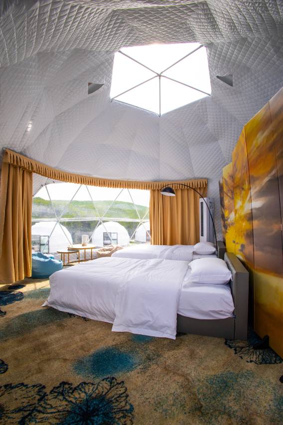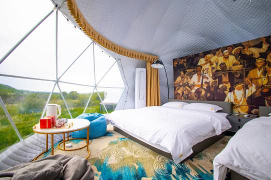 所有的房型都是星空顶!但位置比较有区别,我们住的是B区,离进出口比较远但风景好视野开阔,不要妄想星空顶可以在房间内看星星,根本看不清,一方面顶不是特别透明另一方面是房间内各类小家电灯光太亮。话说房间内的小家电有很多好处,可以无线充电,也可以充当小夜灯。很喜欢这家营地,设计摆设很用心,有一次性洗漱用品包括毛巾。房间内看不到星星,不过推开门还是能看到的,虽营地比较亮稍有影响,但问题不大