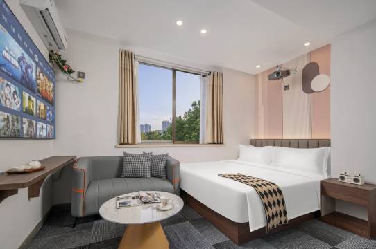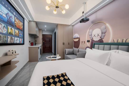房间设施齐全,酒店卫生搞的很干净,投影很清晰,楼下有吃的,附近还有夜市,交通挺方便的,地铁公交都很近