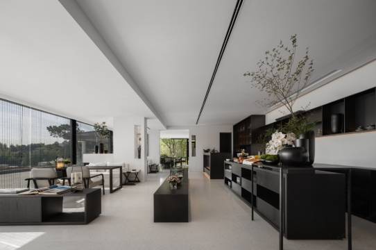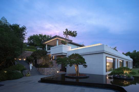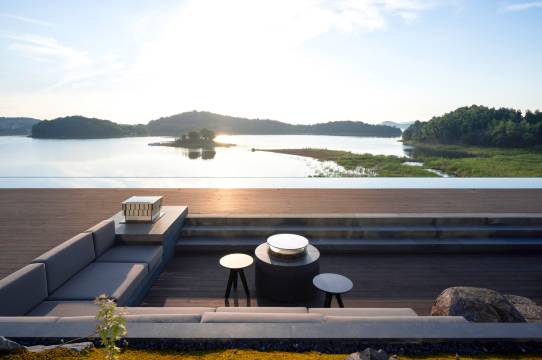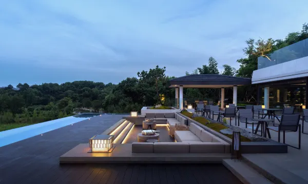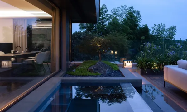 酒店位于成熟的溧阳市天目湖风景区,却自得一隅,私享一段宁静的湖岸线,观近水远山,十分难得。酒店设计集团受委托对园林、建筑及室内进行规划。与水为邻,极简而奢,设计旨在创造可抽离城市日常快节奏高密度信息流、恢复精神、释压身心的度假空间,酒店无处不在的温馨雅致的生活氛围,给诗意的灵魂得以安放。 在这里四季流转,植被生命的转换,都是室内设计重要的空间痕迹。似乎装饰都是多余的,唯有艺术的力量可以与之相呼应、相媲美。