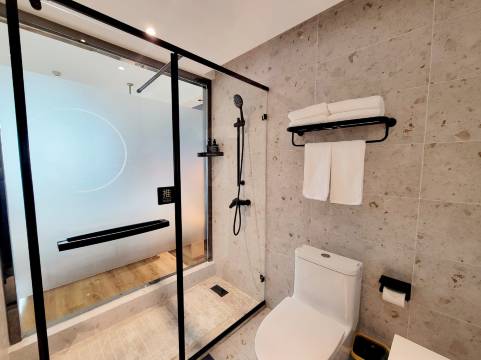 楼下有自己的停车场🅿️,楼下吃东西也便利。房间面积大,卫生间干湿分离。入住体验好。床品舒适。价格合理。