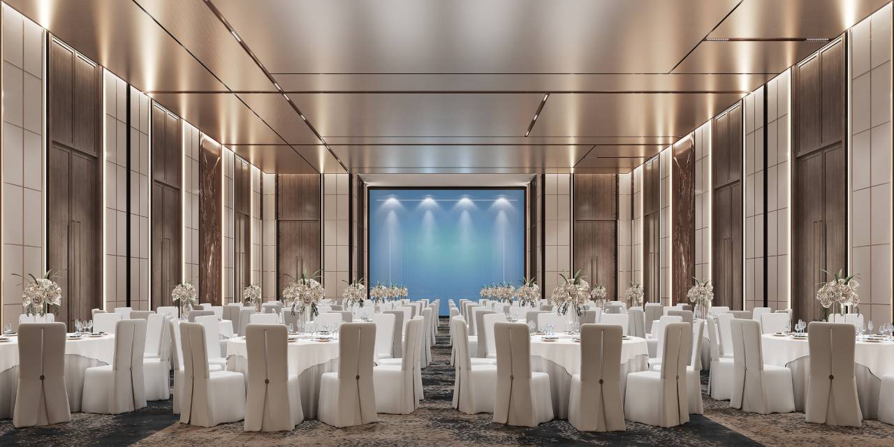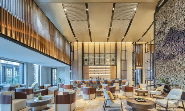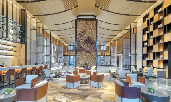 雄安朗悦voco酒店错落有致的中式庭院享有热闹都市中的一方静谧,设计汲取燕赵文化,将天、地、山、水的韵致注入进新潮俏丽的品牌色彩中。步入大堂,白洋淀百里芦苇荡的风光跃然于屏风之上。采用国家非遗钧窑陶瓷工艺烧制巨型山水画,尽显自然灵动。以鲸之形态、燕之展翅的鲲鹏寓意“大鹏一日同飞起,扶摇直上九万里”,集天地之灵气。