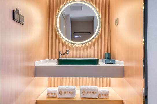 洗手台很大,出热水也快,点赞。背景墙很有盐城特色,挺好看的,房间智能语音系统齐全,太便捷了。