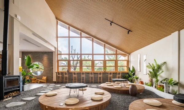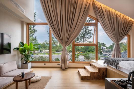 客栈位于彭州市通济镇湔江路与小夫路交叉口,毗邻湔江,一楼有新中式茶饮大厅,设有壁炉、卡座、茶台、沙发等。二楼还有观景平台,很适合眺望龙门山脉。客栈前后中式园林占地近三亩,客栈凉亭品茶看景,也可在池边露营烧烤,后院还有一处中式柴火灶台,可以体验生活做饭的烟火乐趣。客栈还配有一间100平米的多功能会议室,可开会可娱乐,适合家庭、公司聚会。