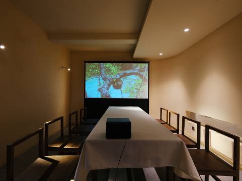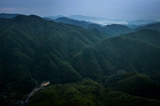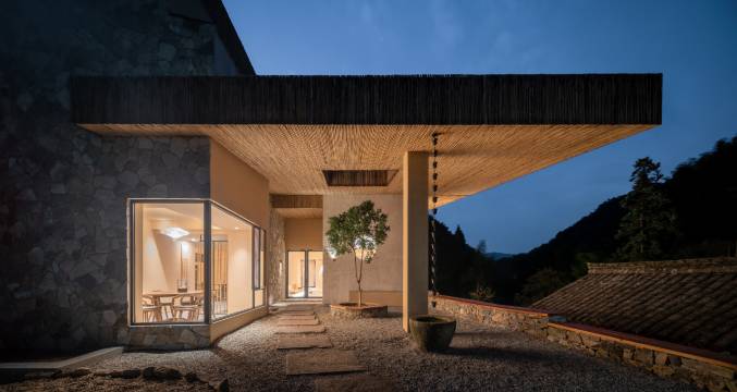 建筑外观将石墙飞檐的概念引入建筑设计,巧借屋山之势,勾勒出一幅观竹海、望远之诗意山水画卷。拾阶而上露台,登屋山以望远,生动且蕴含静穆。与古村的古朴融合那样巧妙,远看就像落于山林间的一处静谧柴院。行云流水般的飞檐,从室外延伸到室内,灵动感在空间内得以延续。一挂流水倾泻而下,顺应着灰瓦流水的意向,亦将石、竹、云、水、光线自然神奇地融合,柔和的灯光、流畅的线条,让人漫步其间感觉非常舒适。