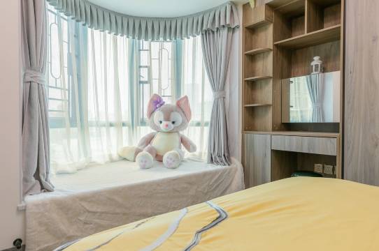 在一个小区里,很安静。房间很大,我们订的是两室的,客厅有厨房,锅碗瓢盆都有。窗户外就是广州塔,卧室还有星空灯,孩子很喜欢。在这里度过了愉快的一个春节。