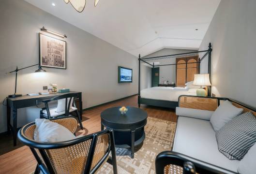 开平会馆是一家主题酒店,客房布置舒适休闲,配备智能家居,还有全景窗景,历史厚重感与现代舒适感无缝衔接。