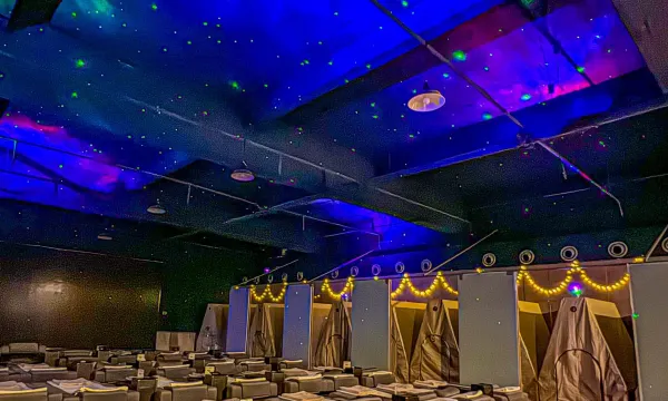 住的格子间,是单独一块区域晚上挺安静的,一个间里有6个铺位,一个充电插口,每个铺位有帘子被子,比想象中宽敞睡起来挺舒适。洗浴地方东西全,洗发水沐浴露卸妆洗面奶牙刷牙膏水乳吹风机等,洗完有浴巾毛巾,可以穿汗蒸衣还有一次性内裤。早上有免费早餐,也挺多种类的,这个价位真的不错