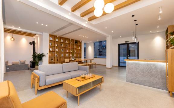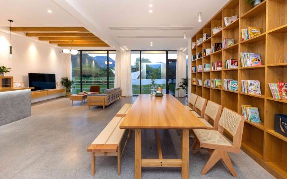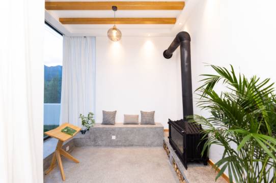 第一次住民宿,因为担心卫生。这次因为离心跳乐园近,而且点评都很好,说走就走的旅行就大半夜预订了。体验非常棒!偏日系的装修风格,干净素雅。大公共区,超长书桌,满墙书籍。饭点时间是餐桌,晚上就变成了住店孩子的临时自修区。暖炉区也是阅读区。大院子里撑起了天幕,不怕晒,又能走进自然。坐在里面看书喝茶,可以消磨一天。老板一家人都特别好。给我们买烟火放,用炉火烤红薯,还帮忙采山间红叶回家装饰。最惊喜的是看到了冬日夜空超级亮的金星。很满足。下次还会再去。