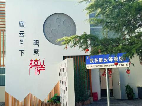 说回小院,“庭云月下 昭露拉萨” 的墙面设计,氛围感直接拉满🌕 石板小径串联起草伞休憩区、秋千打卡点,夜晚灯光一亮,像把星空搬进院子,安静得能听见自己心跳,却又满是生活气。