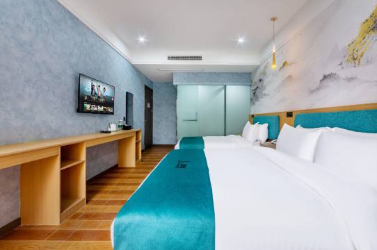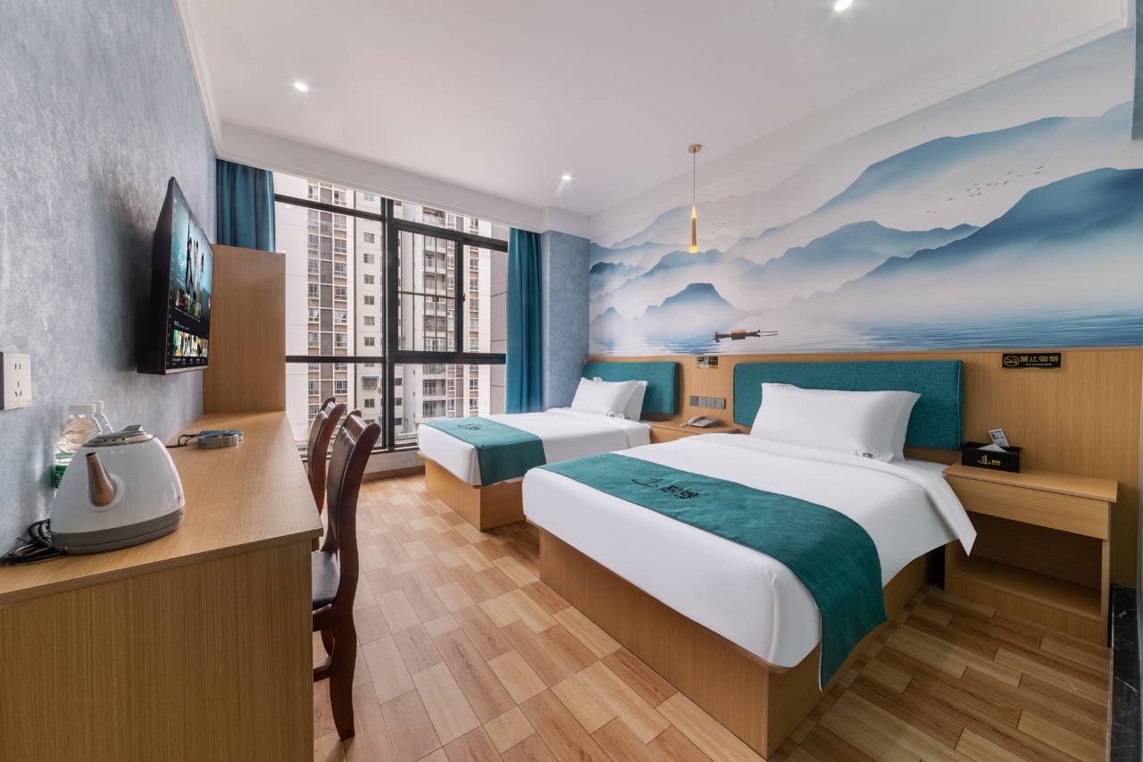 这个酒店就在我们家楼下,这几天正好亲朋好友来了屋头住不到,看到楼下这个酒店新开的,先是打电话问营业没有,前台说正在试营业,预计月底正式营业,然后我就订了个房间,我说试一试,阔以的话下回再来三五个朋友就在楼下订,主打一个就是近,就不用到处跑黑远去定酒店了,然后晚上我带朋友去住,进去看到前台这些小妹儿乖桑桑嘞,一个二个笑嘻嘻的,服务态度也好的很,特别是那个叫周周的小妹儿,带我们去看房间,细心的很,还问我们睡眠浪个样,有没有带几个月的小宝宝给我们安排安静和空气好的房间,最后选了个靠小区的房间,确实这面很安静,房间撒子都是新的,刚开始可能担心甲醛的味道很大嘛,一进房间居然没闻到甲醛味,可能房间卖的比较好,都住没的了,哈哈哈哈,房间卫生这些都还是阔以,进门就是一种很干净,很舒服的感觉,还有就是停车也很方便,我们小区也可以停,酒店楼下也有露天停车场,电车这些都可以充,这一点还是很好,周边也有很多好吃的,夜市啊 火锅串串这些都有,推荐给大家,外地来的朋友也可以放心入住啦,已经给你们踩雷啦