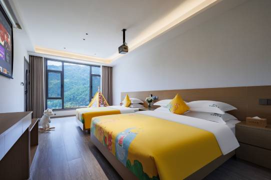 房间非常宽敞,收拾的很干净,卫生条件很好,布局也很合理,房间有很大的桌子和储物空间。洗手间是干湿分离的,配有一次性马桶垫和各种洗漱工具。大床房床很大,床品也很舒服。亲子房间的床也很大。(在山里,但是驱虫做的很好,超级加分!)