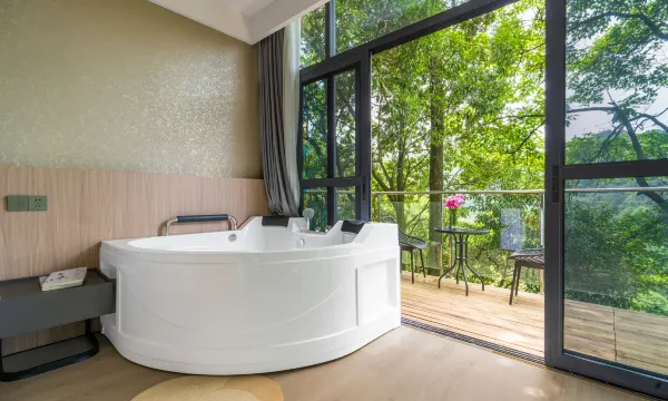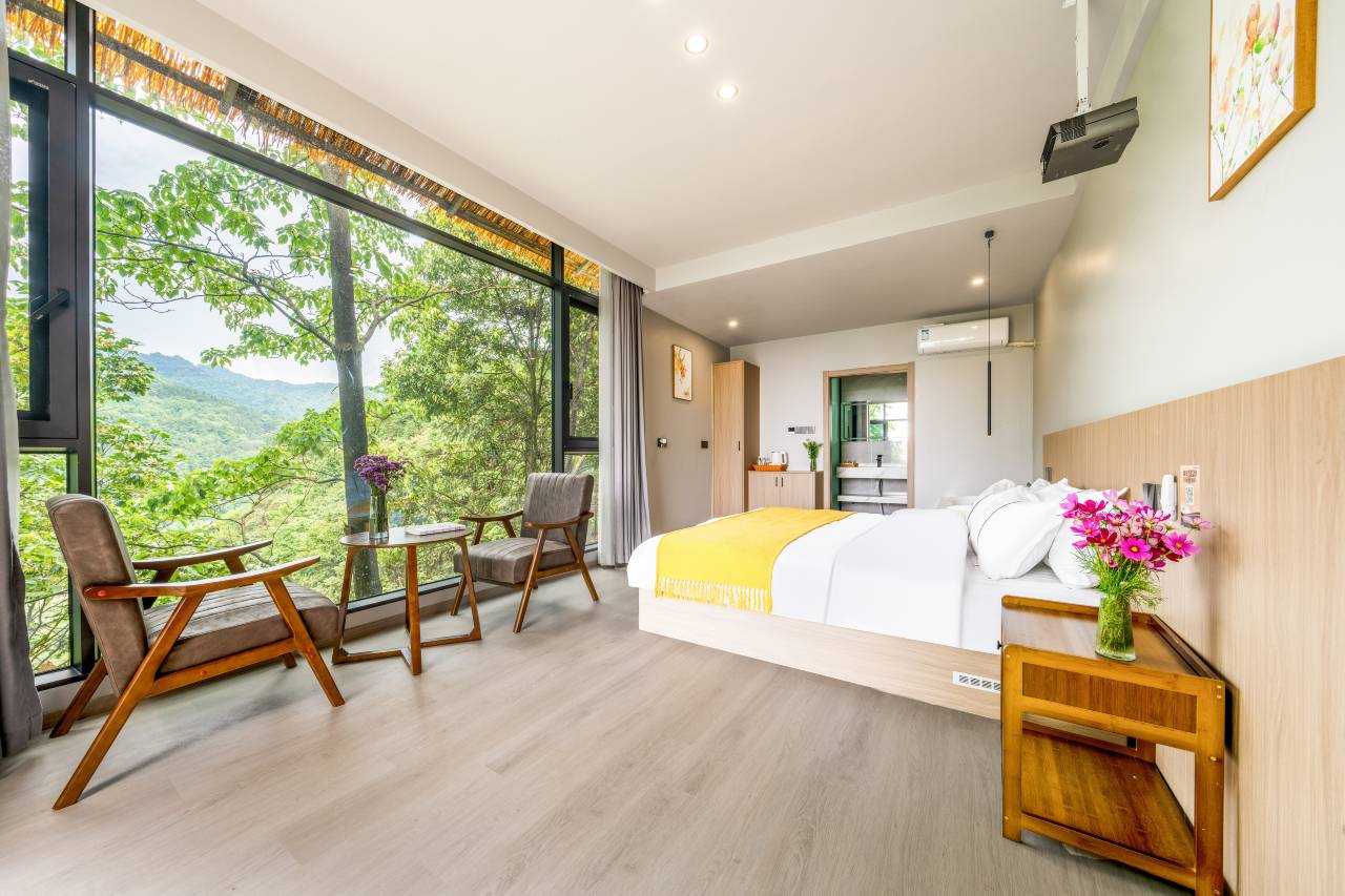 躺在柔软的大床上,通过18度视角的全景窗,一览无余地可欣赏悬崖上的山景。房间有独立阳台,坐在哪里喝喝茶,听听音乐,呼吸着最纯净的山林空气,仿佛整个世界都安静了下来🌌