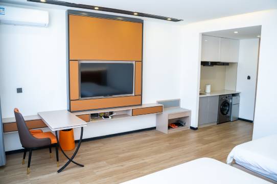 光看门脸不大,房间是真大,设施齐全,适合我这出差的人,解决了,洗衣服,喜欢喝冷饮的我,还能简单做个饭,态度很好,很干净,也很智能,淋浴头也很高级