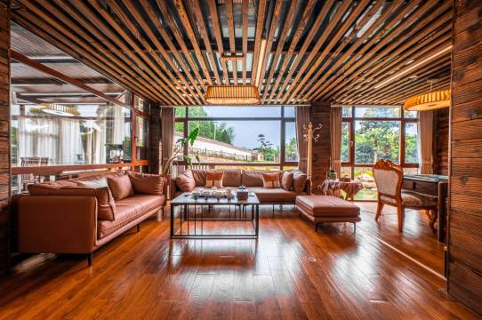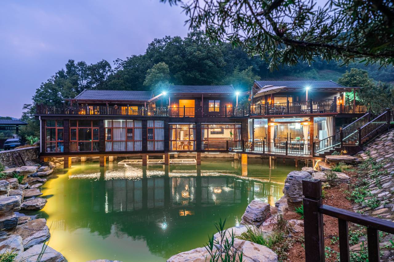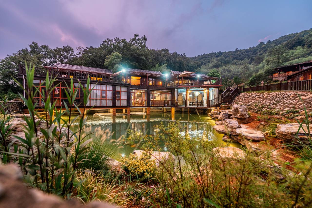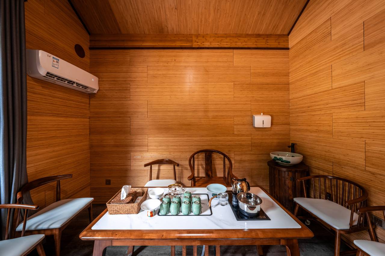 民宿套房有山舍、竹舍和雾舍三间坐落在鱼塘之上别有一番滋味,房间内豪华浴缸、舒适床品、精致衣柜一应俱全,室内设计充满了乡村风情,简约而雅致。房外露台上可以欣赏到翠绿的山景。