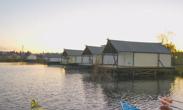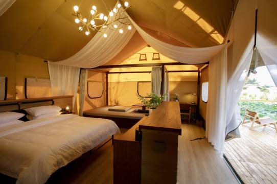 网上看好评很好,选了右里和这家纠结了很久,最后选了这家。机场过去差不多60公里,还是不近,管家式服务,水上帐篷的感觉,该有的设施还是有,在一块水塘上,但管家说是滇池的水,管家还是挺热情的,送了游船票,房间是看不到日出的,和之前评论完全不一样,早餐会送到房间来,够吃。送的小火锅不行,都是肥肉和肉丸,只吃了素菜。走的时候送的伴手礼是玻璃瓶,带不上飞机,最后也丢了。如果是天气不好的话就不建议住这里。