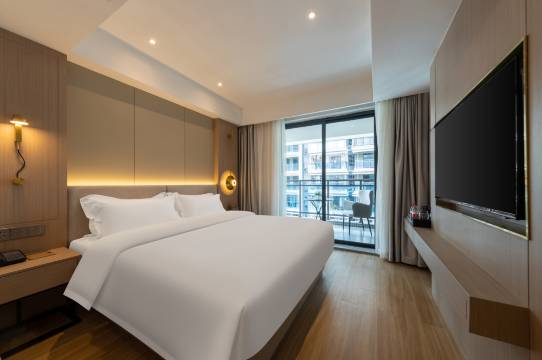 房间干净整洁,有小阳台,床也很软,入住时整个房间有淡淡清香,窗帘遮光很好,白天睡觉也舒服,酒店位置近梅州西站,出行很方便,最主要就是前台服务特别好,服务态度一流,舟车劳顿疲惫不堪,前台查了房型有空房就给办理了提前入住,酒店有地下停车场,和前台登记车牌即可,很方便,消防设施完善、电梯刷卡上楼、机器人送餐均有配备,安全让人放心。