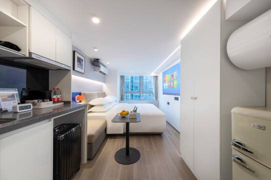 公寓拥有80间全新装修客房,面积25-40平方米,每间客房均配有独立卫生间,配备高清投影仪、冰箱、储物柜等设施,满足商务、休闲与旅居旅客的现代需求。