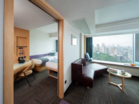 我们住的景致家庭套房空间很宽敞,带娃住完全不挤,房间布局设计得特别合理,分区清晰,孩子超喜欢这样的布局。设施一应俱全,还有超大飘窗能看澳门城景,细节做得很到位。