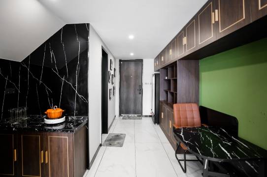 房间非常非常大,地暖也很暖和,床品很干净,窗帘遮光性很好。对接的工作人员一直都是微信及时沟通,就是希望浴室的位置安装个摆放洗护用品的架子会更方便,不然洗护用品还要放在地面上。周边吃饭非常方便,有万达广场和各种底商。停车也很方便直接地库停车电梯直达!房间的价格绝对物超所值~下次还会入住!
