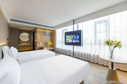 酒店距离比亚迪二厂很近 周边点外卖很方便,很快机器人就送到房间门口了 前台服务人员热情有礼貌,房间也是打扫的很干净,酒店地暖开放房间非常暖和 香氛的味道很独特超级好闻!早餐种类多样 中西结合 满足各种口味需求~臊子面味道也是超赞![强][强][强]
