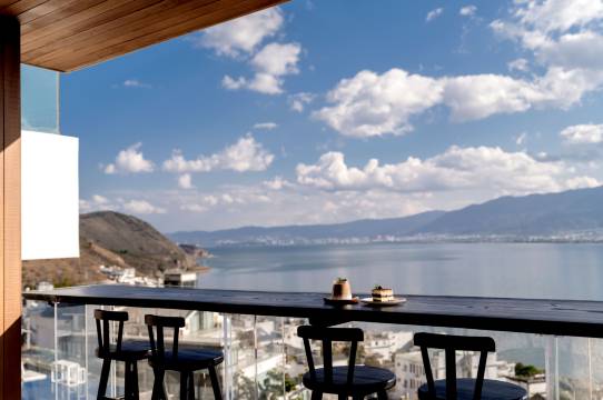 民宿位于彩虹公路上方,独立安静,纯白的希腊风,房间装修典雅精致,每个房间都有可以看苍山洱海的露台。我最喜欢我270度海景的房间,每天睁开眼睛就打开窗帘,看晨光中的山与海。房间出去,还有一个玻璃栈道,通往一个观景小平台。