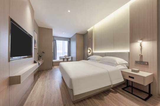 房间很宽敞明亮 住着很舒适 续住了几天阿姨经常来送水 一次性用品齐全 电视响应挺快的 空调也给力 没有什么噪音 晚上睡得很好 不过智能助手的普通话要求太高了
