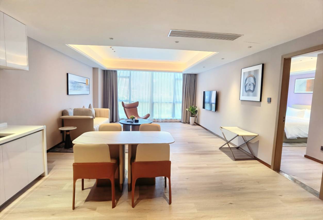 房间是公寓式酒店,离主城比较近,去附近玩比较方便,周围吃饭的也多,有点类似居民区,离高铁站打车10分钟。