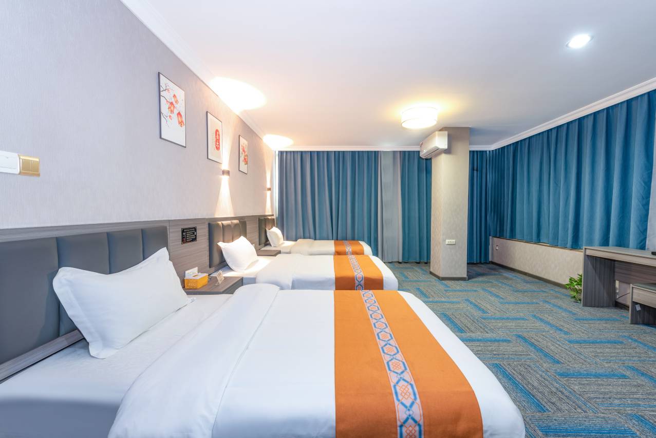 本店位于广西壮族自治区桂林市灵川县八里街新华路1号(人人乐斜对面),多路公交途经停靠于此(八里三路口),公交301路、302路、306路、116路、112路可直达灵川汽车总站、桂林两江四湖、市中心等,交通便利。距离桂林火车北站、火车西站方便快捷,所处地理位置佳。走路10分钟有宵夜摊,大型夜市!让您流连忘返。大堂区域有休闲茶室,有自己旗下的旅游公司,房地产还有餐饮,可提供客户早餐。客房新豪华装修,内部环境整洁卫生干净,均配备舒适柔软的床上用品,内设空调,24小时热水。墙上挂有画卷,增添了几分艺术气息。采光通风良好的房间布局,先进完善的配套设施,更是为您打造性价比超高的美好住宿体验。且提供行李寄存便捷的商务服务,给您宾至如归的感觉。酒店楼下可提供停车,还有超市。酒店是您旅游、出差的不二选择,我们在此热烈欢迎您的到来。四季在变,我们的温暖不变。