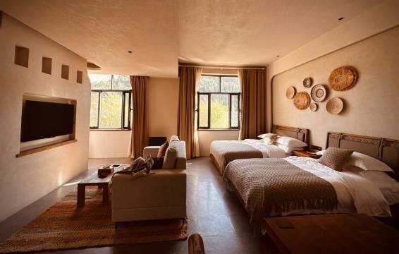 很不错的民宿,虽然贵了一些,但是整体的运营和环境设施很不错,尤其是晚餐,订之前就是看中了它们的餐厅,果然味道极佳,尤其推荐葱爆牛肉和炒烤肉,太香了!肉特别的嫩!还去参观了一下木屋和帐篷,也很有氛围,很多亲子家庭出行,优秀的民宿。