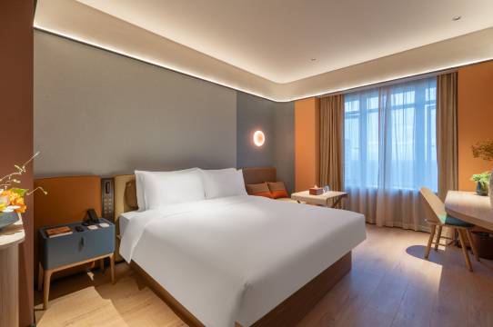 本店隶属华住集团。桔子品牌是华住旗下中高端的主力品牌,设计灵感来源于加州的桔子郡,秉承阳光,健康,活力的新品牌理念,崇尚年轻化,简约,自由,随意的情调和时尚开放的Party氛围,酒店配备会议室,免费地下停车场,自助式早餐厅,24小时健身房及自助洗衣房等设施。本酒店位成都简阳市简城街道万汇中心一期7号楼A座1层106号。距离天府机场车程20分钟(请勿看直线距离)。我们酒店门口有机场大巴可免费接送至天府国际机场。客房楼层在20-23楼,窗外树林与丘陵相结合的景色十分优美。客房配备智能客控系统,智能马桶、冰箱、65寸超大液晶电视,床具采用金可儿床垫,门窗为双层中空玻璃,能保证睡眠的舒适度。