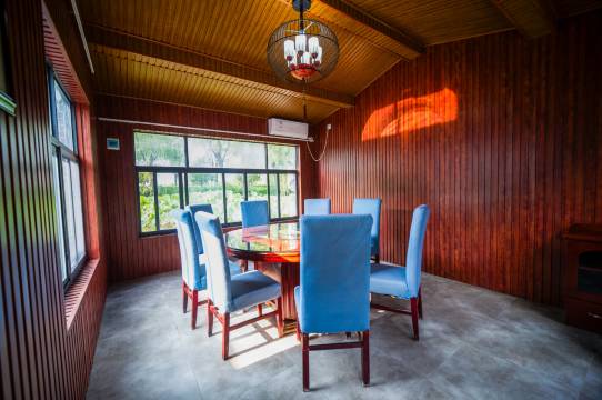 漫步洛阳灵山脚下,发现一处天然温泉度假胜地——露雨轩。这里静谧宜人,与灵山莲花公园相依相伴,溪流潺潺,山峦巍峨,风景美不胜收。 在这片自然怀抱中,度假村宾馆布置简约典雅,豪华套房、单人间、标准间,各具特色,配备独立空调、光纤等现代设施,让您享受别样的起居生活。温泉水直通客房,润泽身心,解除一天的疲惫。置身其中,仿佛沐浴在大自然的怀抱中,感受禅修文化的静谧与放松。餐厅设有豪华包间、水上包间、宴会厅,共180个餐位,可容纳团建、聚餐等不同需求,为您呈现美食与自然景色的完美融合。两个会议室灵活应对各类商务或团队活动,小型至大型会议室应有尽有,可容纳240人同时开会,为您提供贴心周到的服务。 露雨轩温泉度假村,将宾客至上,以美食和自然景色为媒介,让您在舟车劳顿与闲暇之余,充分体验大自然的馈赠与生活的美好。来吧,一起感受这份内涵与自然之美!