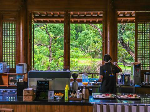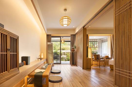 家具采用原木定制,保留原木的纹理、简约特质,卫浴、床品全部采用国际知名品牌,茶器也全部采购自日本京都。