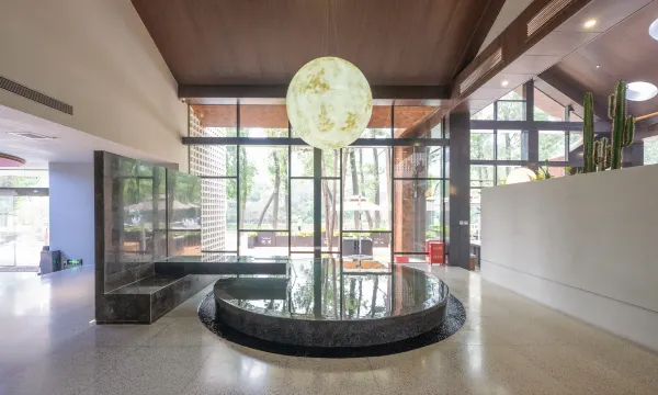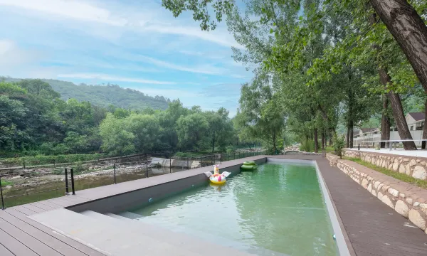 餐厅内有12张长形餐桌,5张圆形卡座,6张临泉餐桌以及二楼1间独立包间和3间连通包间(连通包间共可容纳35人),是团建聚餐的理想选择。酒店配备公共烧烤区,使用时间截至晚上10点。餐厅一侧还设有图书区以及淘气堡。大堂中央的水吧台,夏日一杯冰咖啡,冬日一杯热奶茶,与窗外山水间的景色,生活本该如此。
