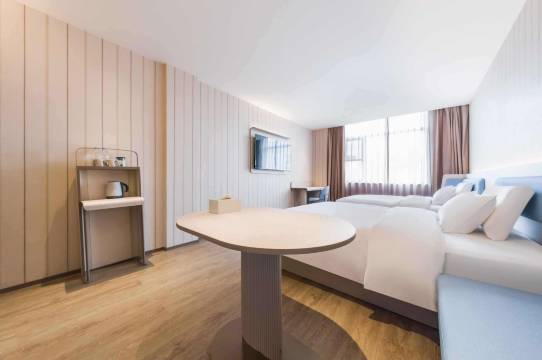 非常愉快的一次入住体验……前台小姐姐很热情,酒店安保很到位,房间设施齐全舒适,干净清爽,还配备电蚊香,两张1.5米大床,一家四口住着非常舒适。地理位置很好,就在银泰旁边,方便我们吃晚饭,顺便逛一下。点了**买药,机器人给你送到门口,好洋气的哟。