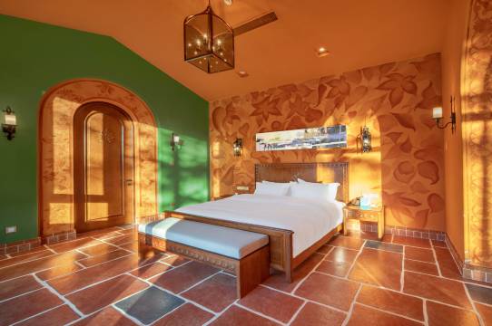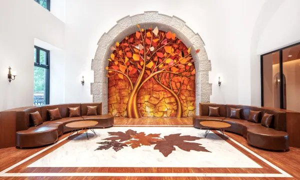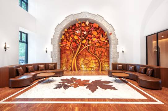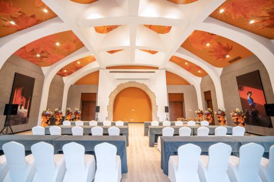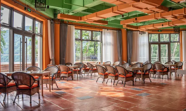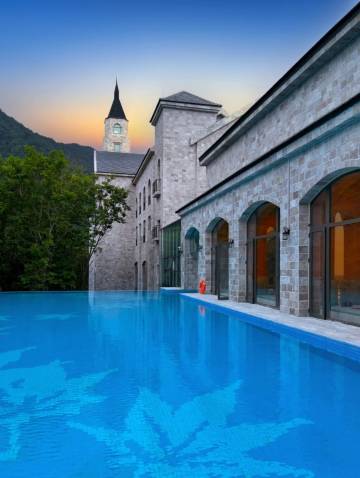 酒店依山而建,四周被森林环绕,空气清新,仿佛置身天然氧吧。城堡设计融入了枫叶元素,客房的大落地窗让山景一览无余,尤其是清晨云雾缭绕时,宛如仙境。