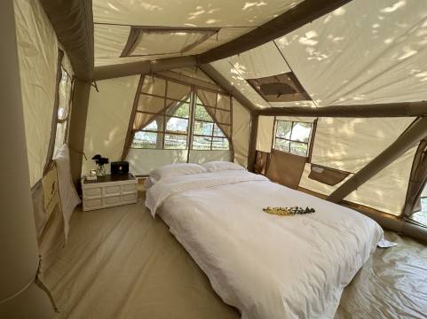 帐篷里边收拾得特别干净,贴心得准备了夜灯自己可以随手携带的小灯,可以挂在帐篷顶也可以拿着照路,营地到处都是各种盛开的小花,还铺设了石子小路,避开帐篷埋线,非常安全,还有很多树,历史日光暴晒也可树下乘凉,舒爽。